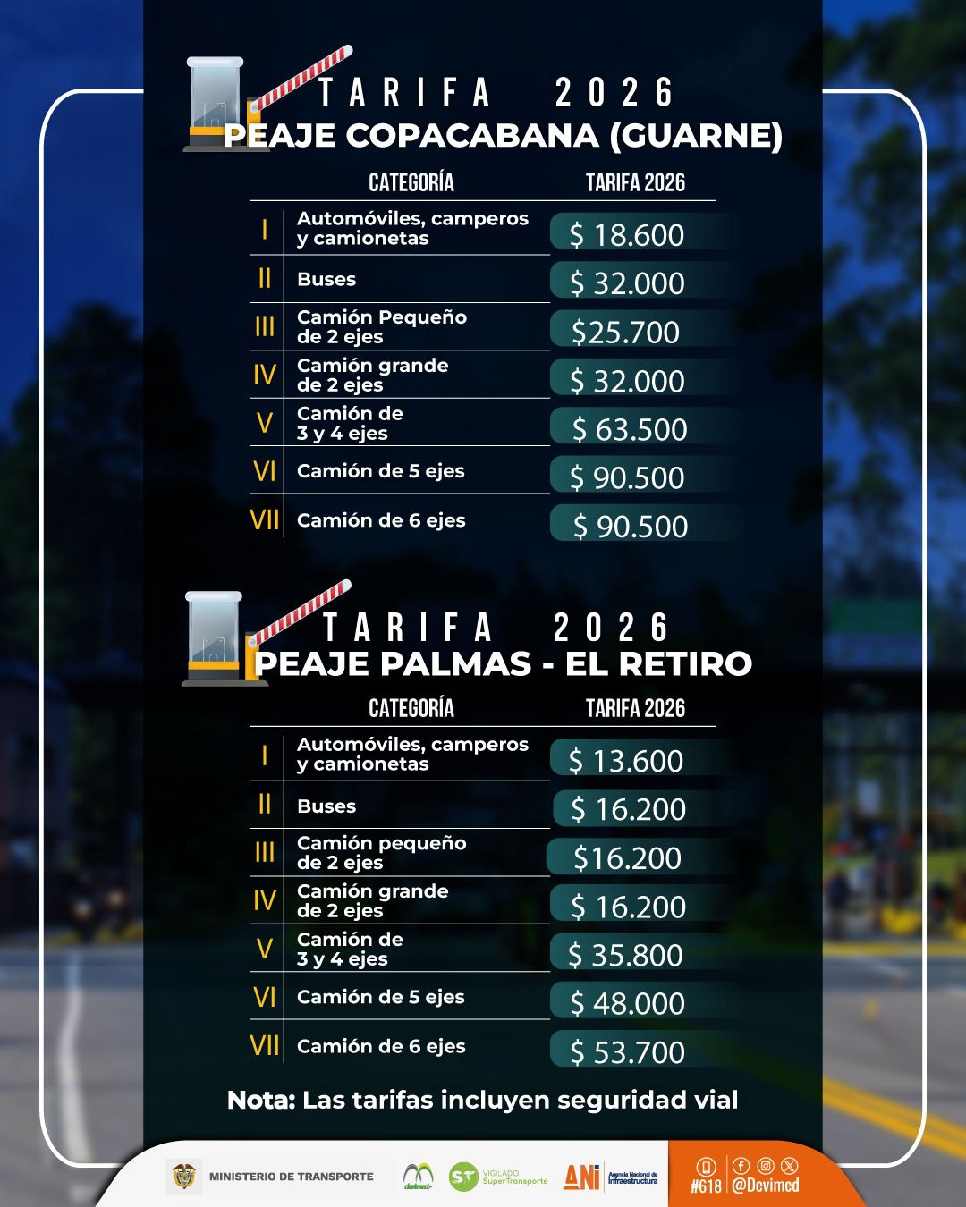 El concesionario Devimed dio a conocer las nuevas tarifas que regirán a partir de las cero horas del 1 de enero de 2026 en los peajes de Copacabana (Guarne), sobre la autopista Medellín–Bogotá, y Las Palmas, en jurisdicción de El Retiro.