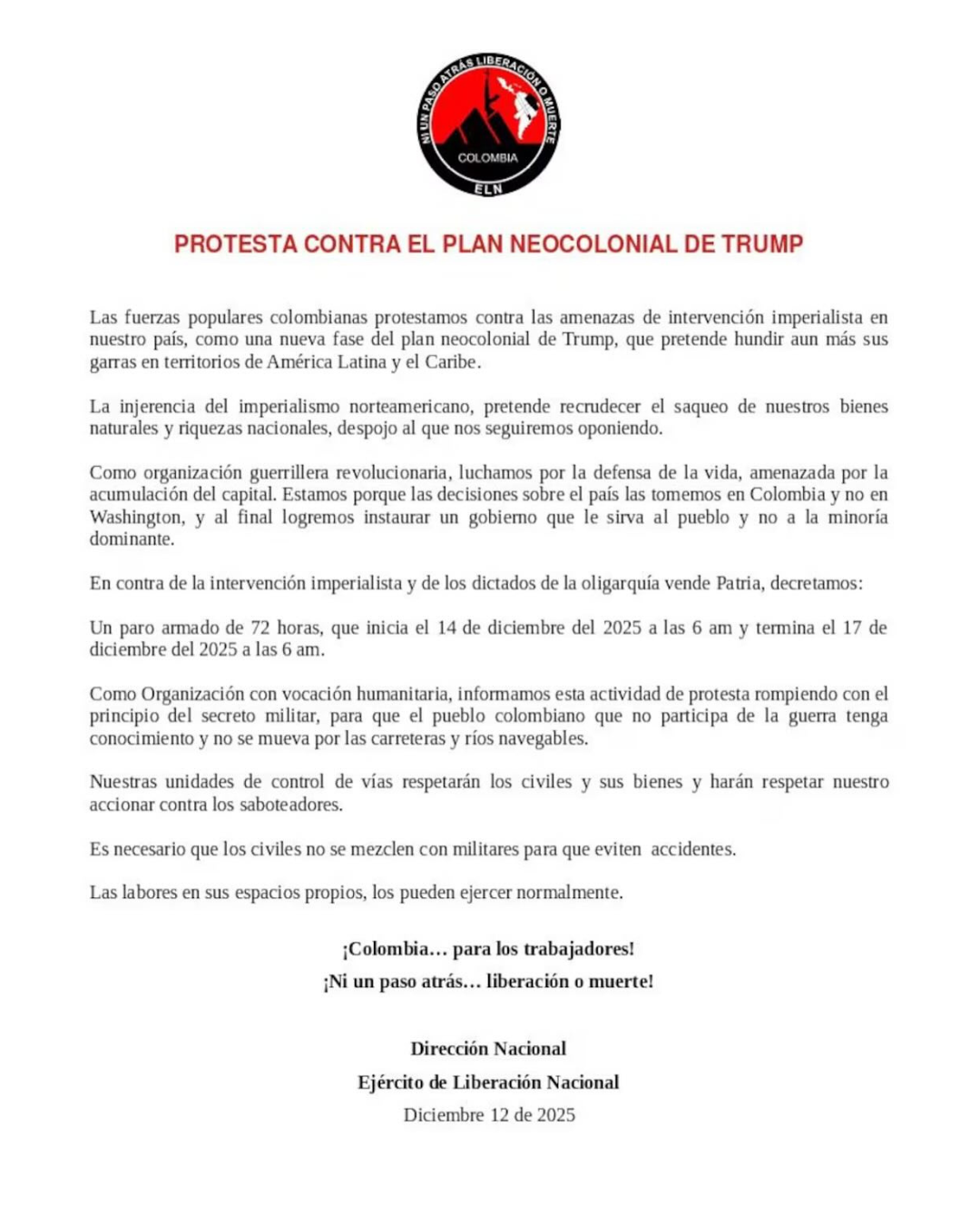 El Ejército de Liberación Nacional (ELN) anunció este jueves, a través de un comunicado, la realización de un paro armado de 72 horas en todo el país, que comenzará el domingo 14 de diciembre de 2025 a las 6:00 de la mañana y se extenderá hasta el miércoles 17 de diciembre a la misma hora.