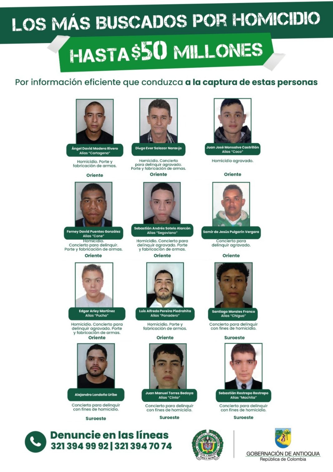 La Gobernación de Antioquia, en articulación con las autoridades judiciales y de Policía, dio a conocer el cartel de los más buscados por el delito de homicidio en el departamento, en el que se ofrece una recompensa de hasta $50 millones por información que conduzca a la captura de los señalados.