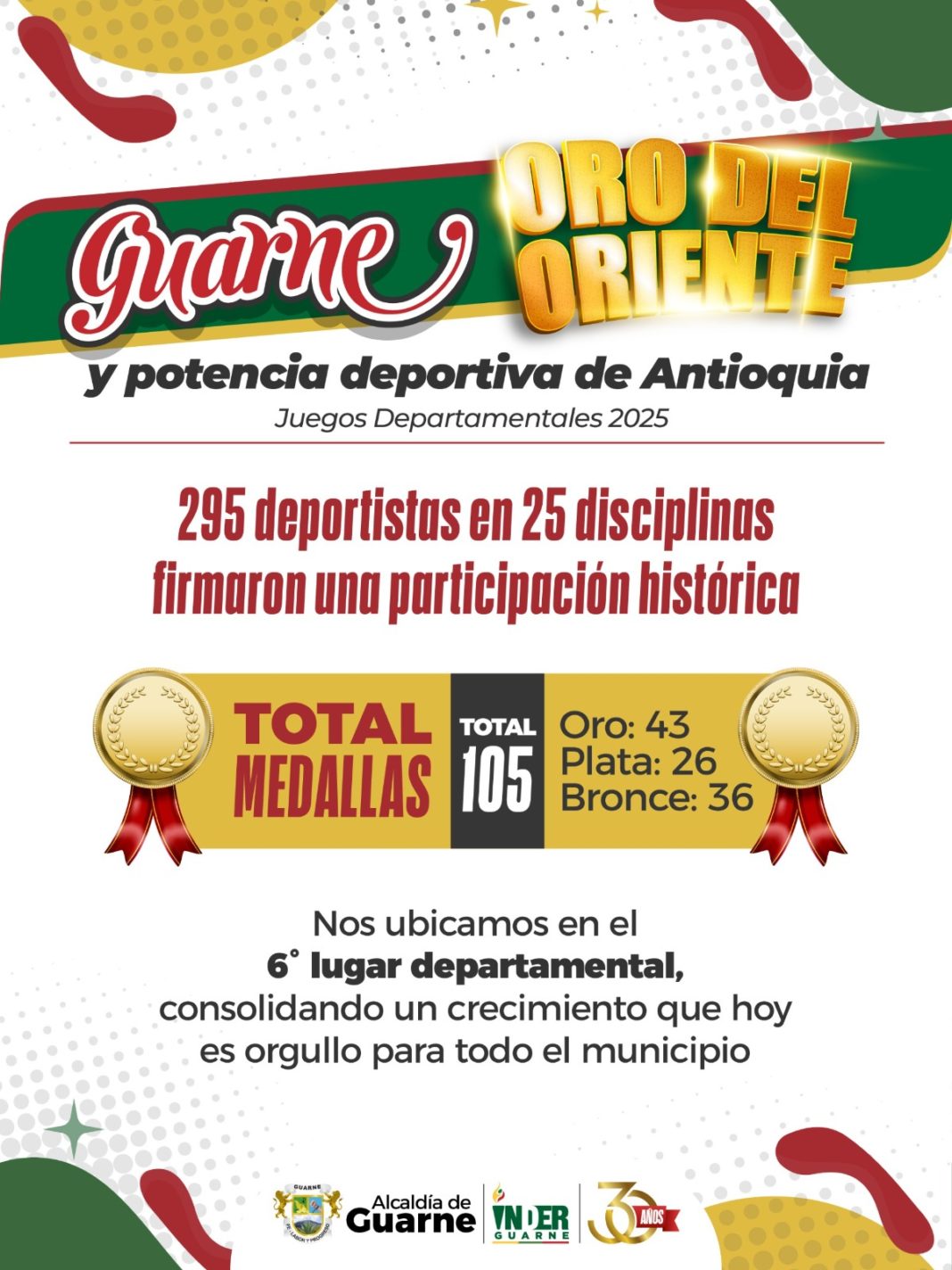 De acuerdo con los registros del Instituto de Deporte y Recreación, Guarne pasó de obtener resultados modestos en sus primeras participaciones a consolidar procesos sólidos que alcanzaron su punto más alto en 2025, año en el que logró 105 medallas, de las cuales 43 fueron de oro, y se ubicó en el sexto lugar entre 125 municipios del departamento.