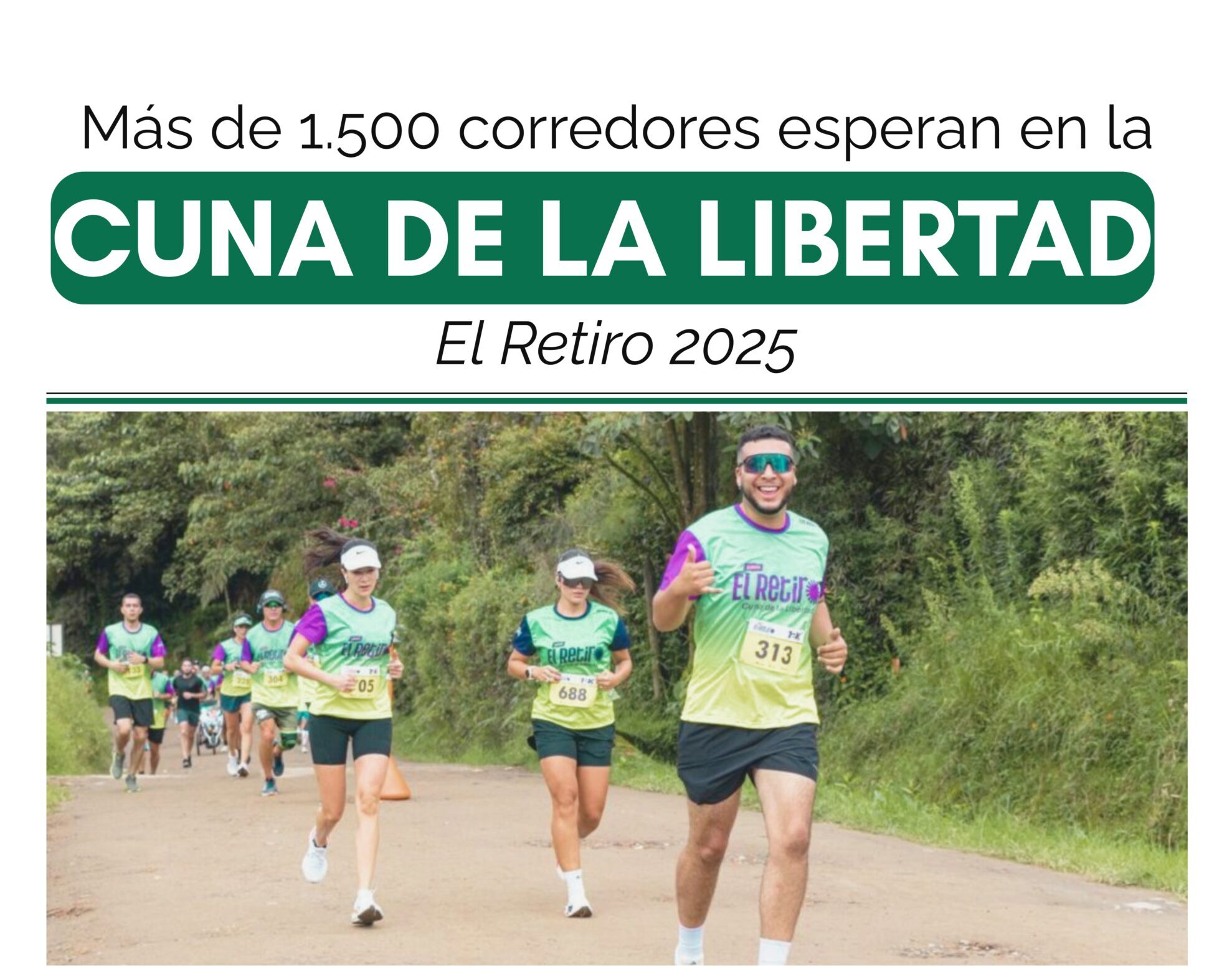 El municipio de El Retiro ya calienta motores para recibir la Carrera Atlética Cuna de la Libertad 2025, que se realizará el próximo 16 de noviembre. El evento organizado por la alcaldía municipal y el Instituto de Deportes ofrecerá dos distancias, 6K y 12K, con un componente social que destaca por cada inscripción financiando dos becas universitarias para jóvenes sobresalientes del municipio, gracias a una alianza con la Escuela de Ingeniería de Antioquia y el programa Futuros Compartidos.
