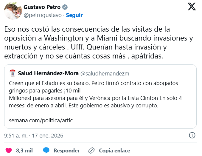 A través de su cuenta en la red social X, el jefe de Estado defendió el gasto y aseguró que la contratación responde a acciones adelantadas por sectores de la oposición en territorio estadounidense.