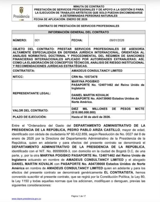 De acuerdo con la información oficial, el Contrato de Prestación de Servicios Profesionales No. 001 de 2026 fue firmado el 9 de enero de 2026, con un plazo de ejecución hasta el 30 de abril del mismo año, por un valor cercano a los $10.000 millones.