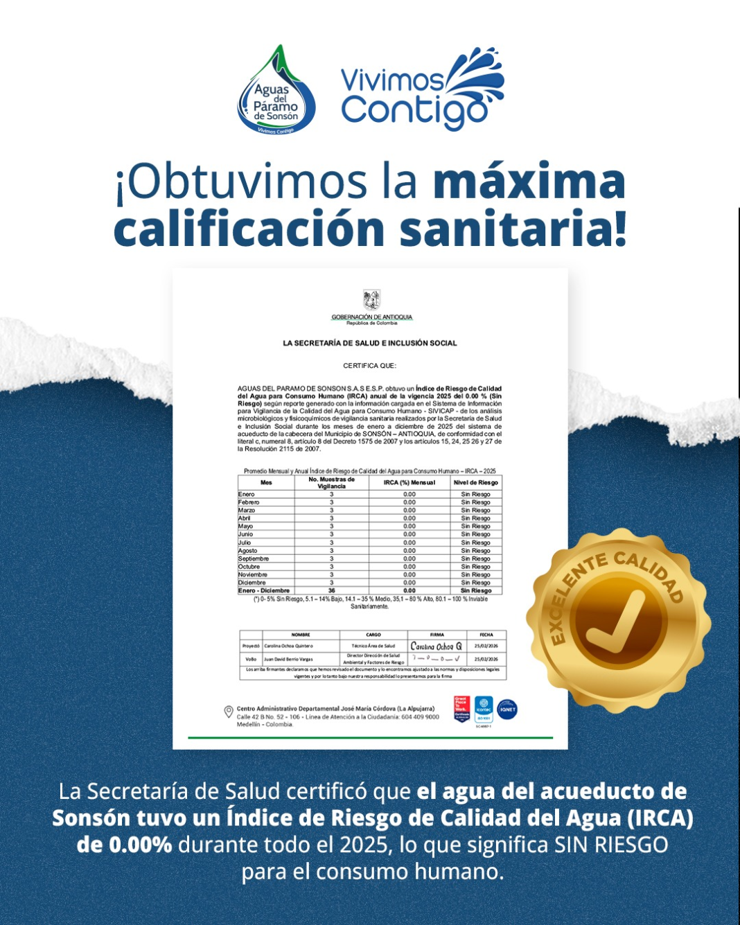 La empresa Aguas del Páramo de Sonsón S.A.S. E.S.P. destacó que esta excelencia operativa no es casual. Durante todo el año 2025, se realizaron 36 muestras de control sanitario de forma periódica, y en cada uno de los análisis el resultado fue el mismo: pureza absoluta. Este indicador mide variables físicas, químicas y microbiológicas que aseguran que el líquido cumple estrictamente con la normativa nacional vigente.